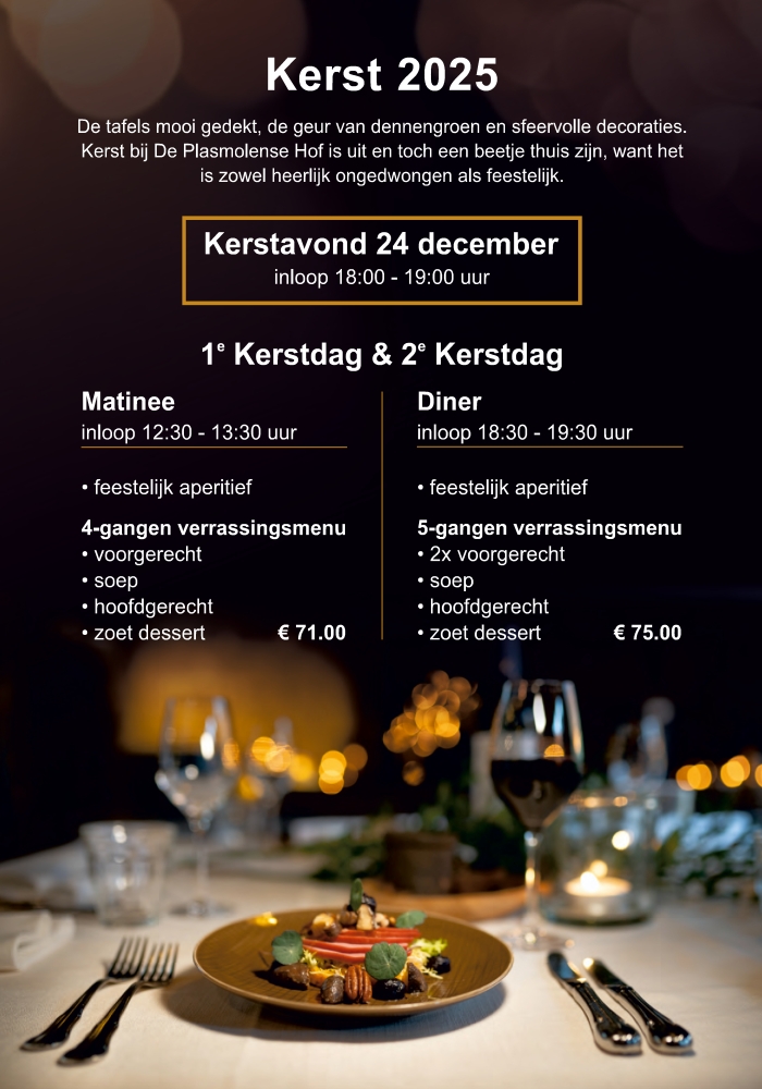 • 1e en 2e Kerstdag DINER: ontvangst tussen 18.30 en 19.30 uur € 75,- p.p.